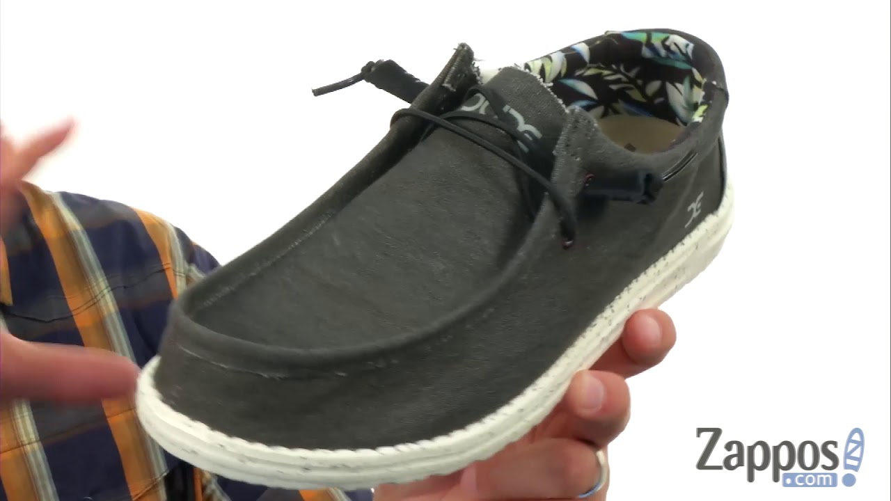 Assuming you’re referring to the brand of shoes called Hey Dude: 1. Thread one end of the laces through the top left eyelet, going from the inside of the shoe towards the outside. 2. Cross the laces in front of the shoe and thread them through the next eyelet on the right, again going from